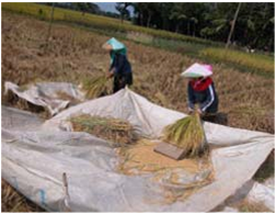 (b) Hasil rontokan berupa gabah kemudian dikumpulkan.